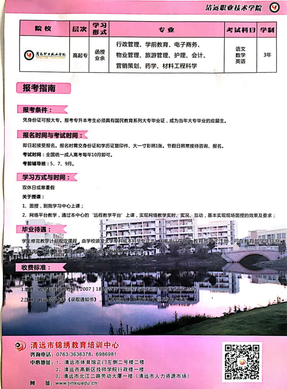 北京大學(xué)、清遠(yuǎn)職業(yè)技術(shù)學(xué)院圓夢(mèng)計(jì)劃正式啟動(dòng),三年學(xué)費(fèi)只需5000元,考試前一百名三年學(xué)費(fèi)只需1000元,心動(dòng)不如行動(dòng),趕快加入圓夢(mèng)計(jì)劃吧!咨詢熱線:0763-3630112  報(bào)名地址:清遠(yuǎn)市北江二路勞動(dòng)大廈一樓